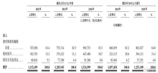 2024年,公司来自微型传动取驱动系统的收入为9。66亿元,占比为63。3%,来自细密部件的收入为4。67亿元,占比为30。7%;其余还有少部门收入来自模具产物。